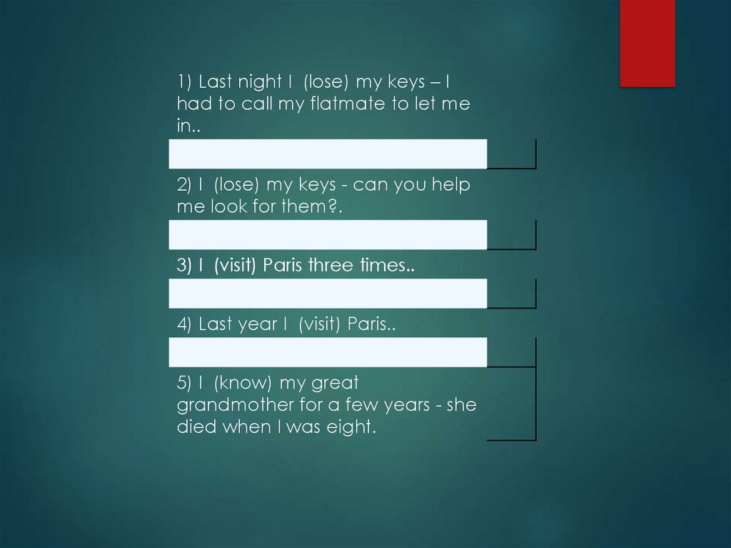 1) Last night I (lose) my keys – Ihad to call my flatmate to let me