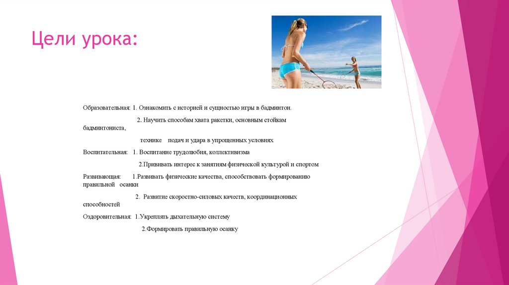 Цели урока:Образовательная: 1. Ознакомить с историей и сущностью игры в бадминтон.