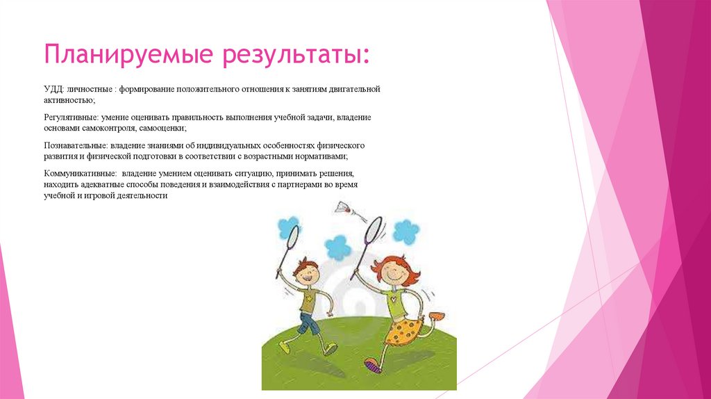 Планируемые результаты:УДД: личностные : формирование положительного отношения к занятиям двигательной