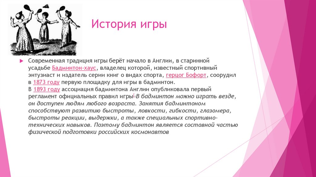 быстроты реакции, выдержки, а также специальных спортивнотехнических навыков. Поэтому бадминтон является составной частью