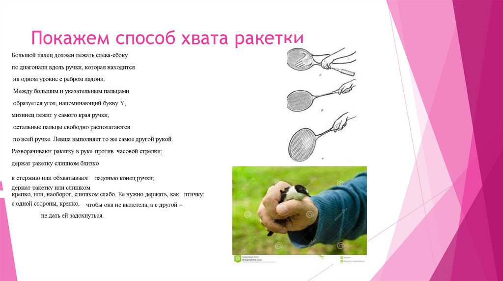 Покажем способ хвата ракеткиБольшой палец должен лежать слева-сбоку