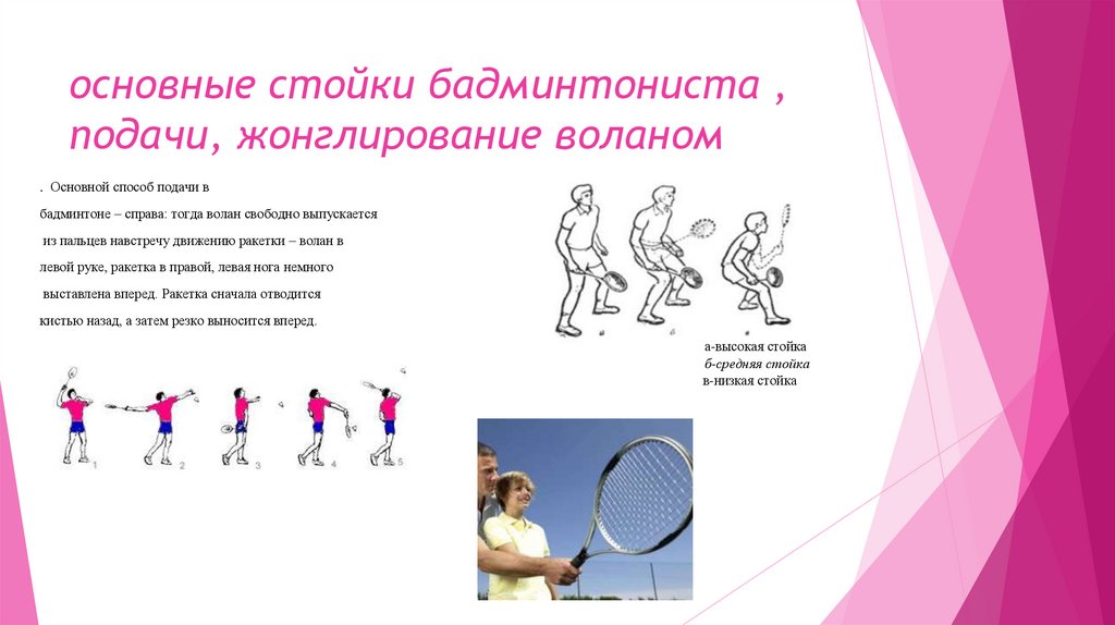 основные стойки бадминтониста ,подачи, жонглирование воланом