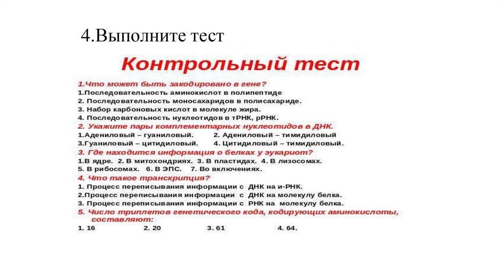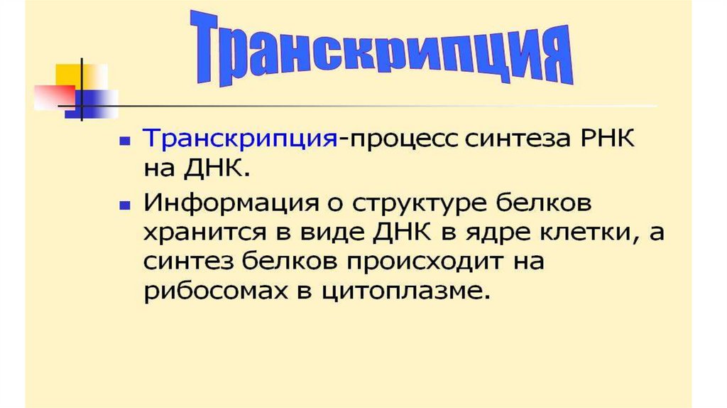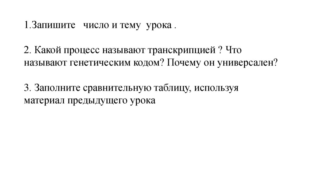 1.Запишите число и тему урока .2. Какой процесс называют транскрипцией ? Что