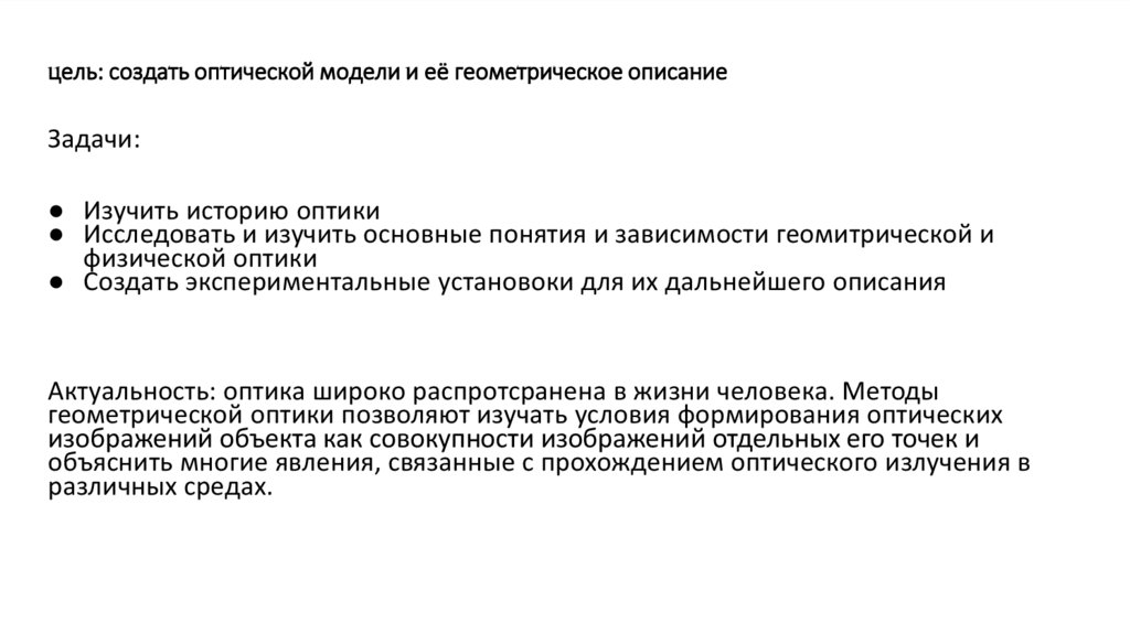цель: создать оптической модели и её геометрическое описаниеЗадачи: