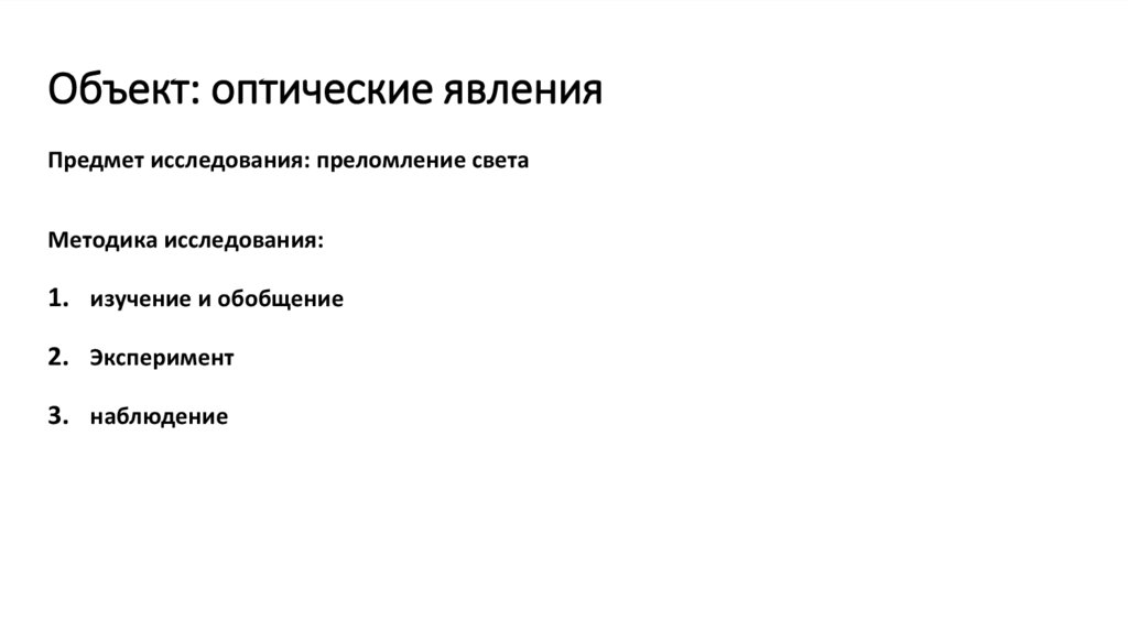 Объект: оптические явленияПредмет исследования: преломление света