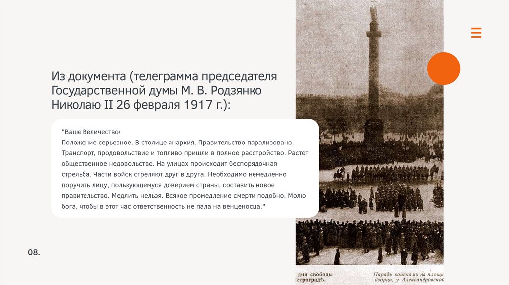 Из документа (телеграмма председателяГосударственной думы М. В. Родзянко