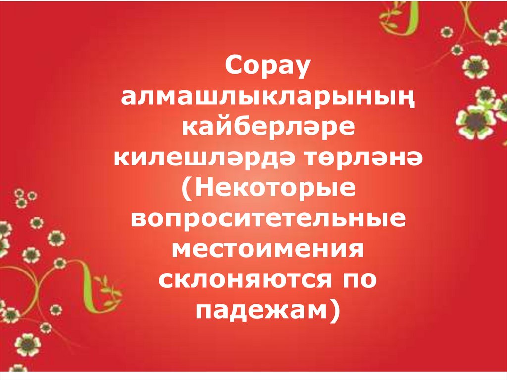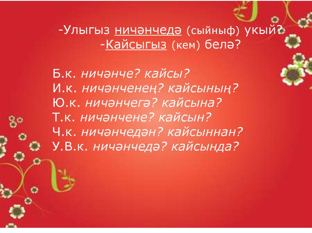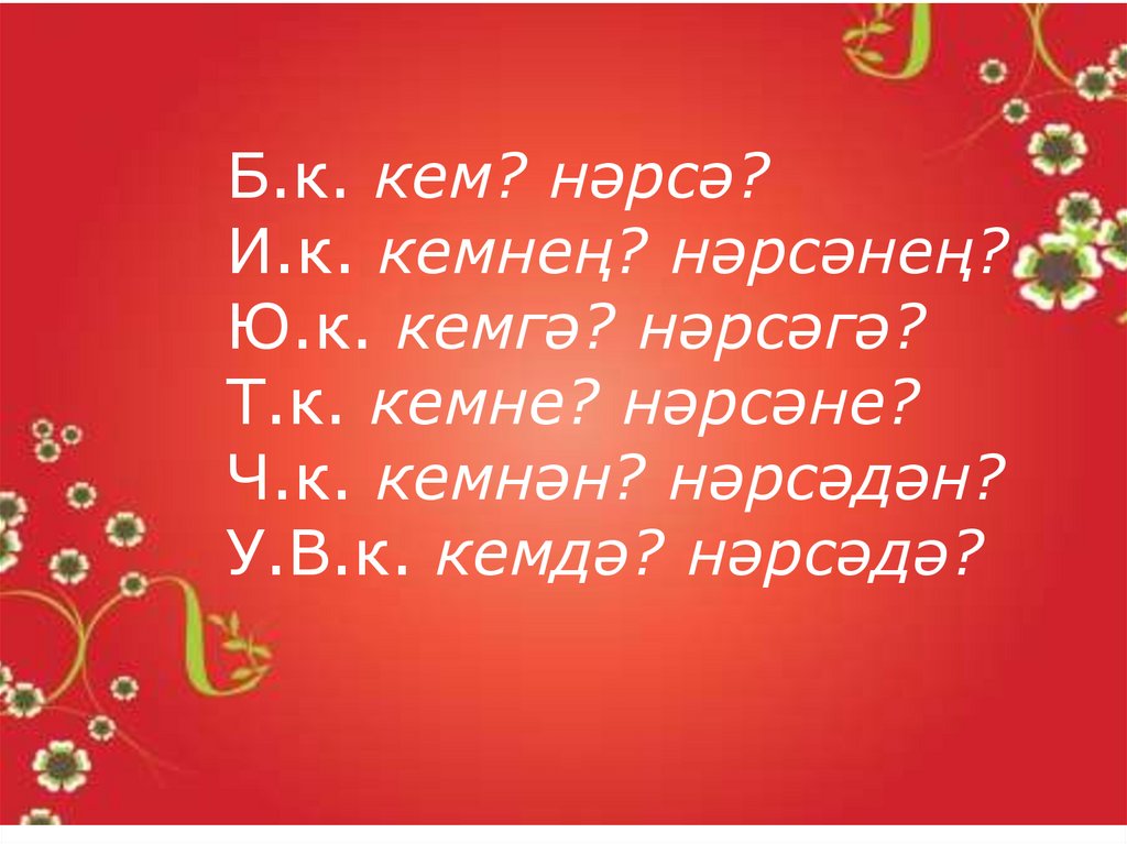 Б.к. кем? нәрсә?И.к. кемнең? нәрсәнең?