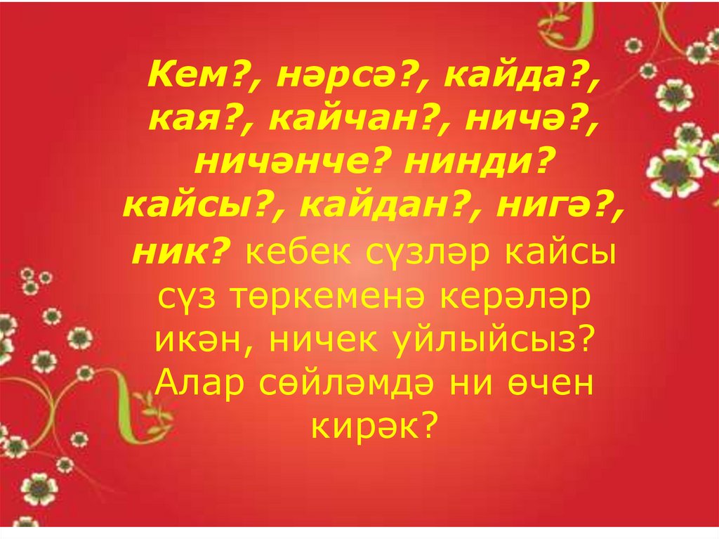 Кем?, нәрсә?, кайда?,кая?, кайчан?, ничә?,