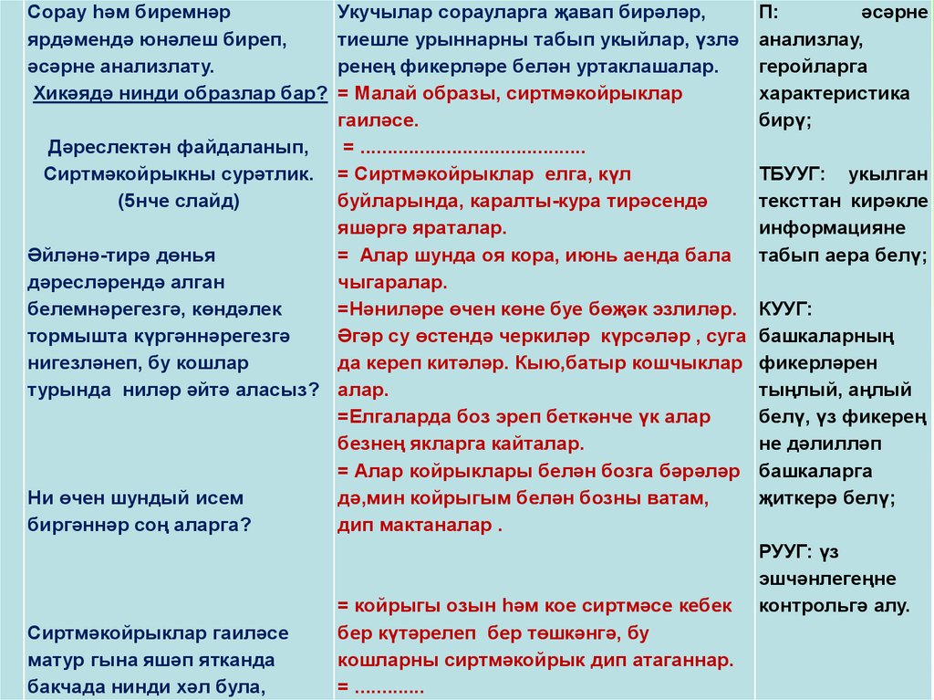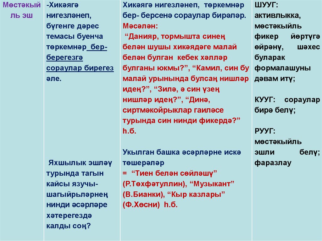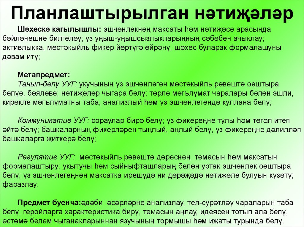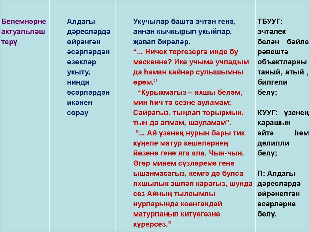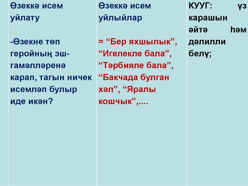 белү, геройларга характеристика бирү, темасын аңлау, идеясен тотып ала белү,