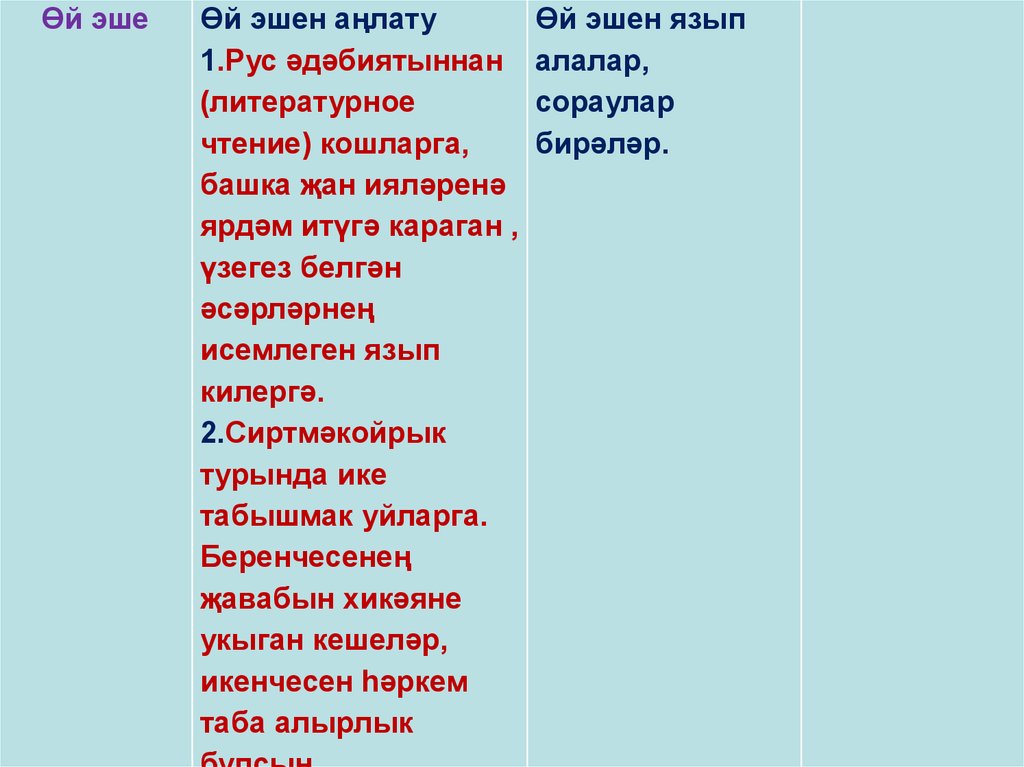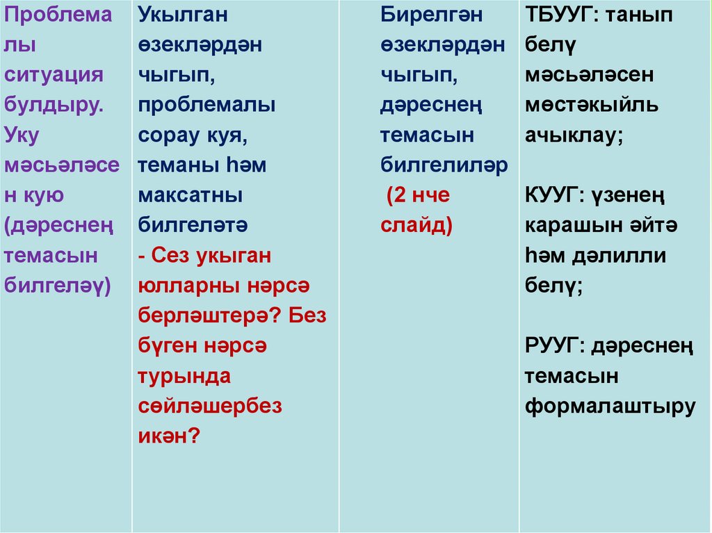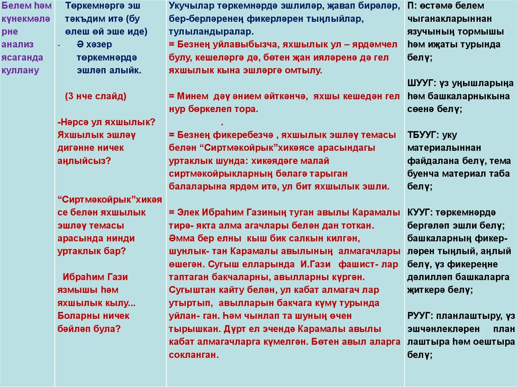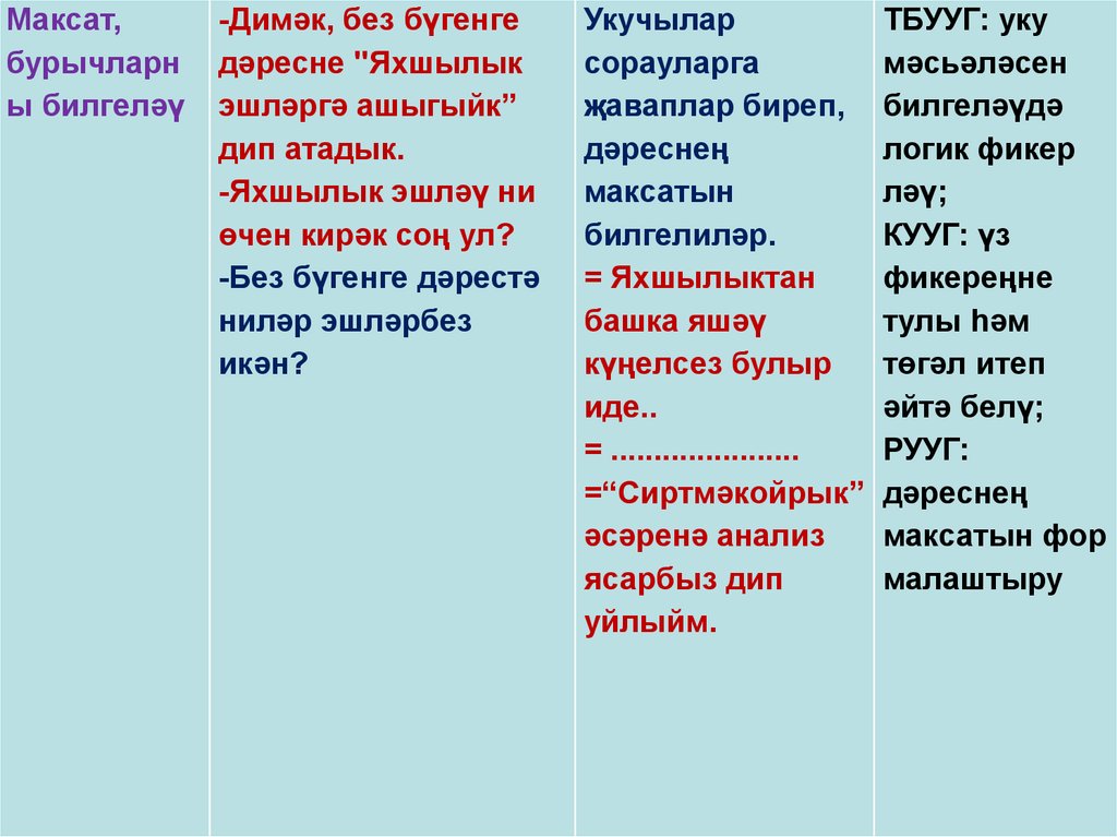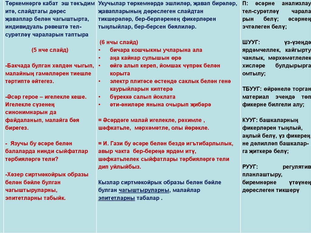 белү, геройларга характеристика бирү, темасын аңлау, идеясен тотып ала белү,