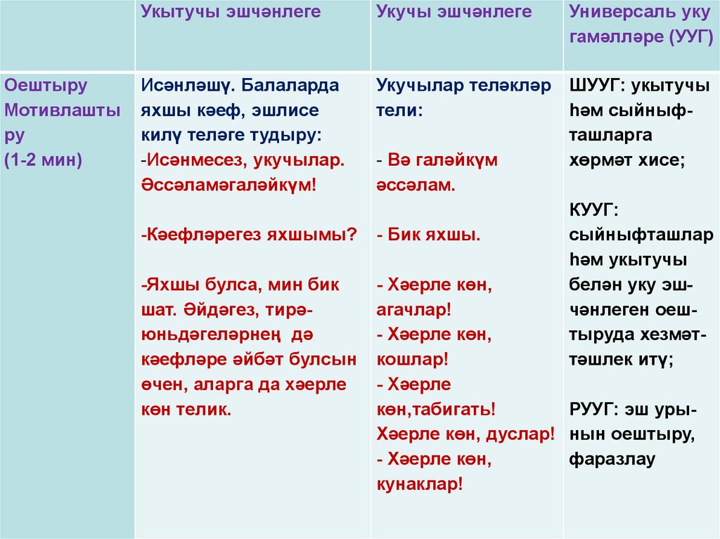 формалаштыру; укытучы һәм сыйныфташларың белән уртак эшчәнлек оештыра