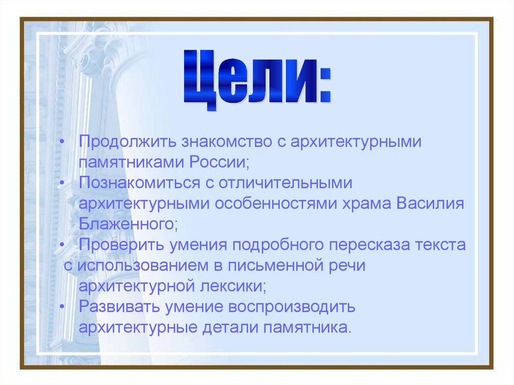 • Продолжить знакомство с архитектурнымипамятниками России;