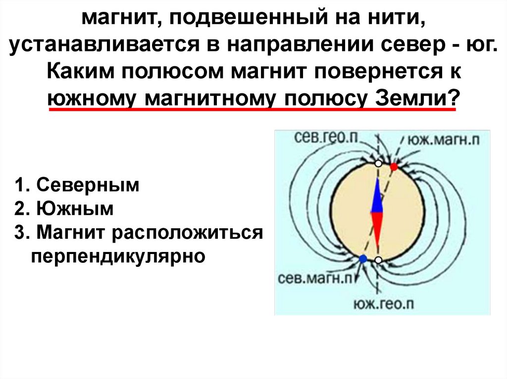 магнит, подвешенный на нити,устанавливается в направлении север - юг.