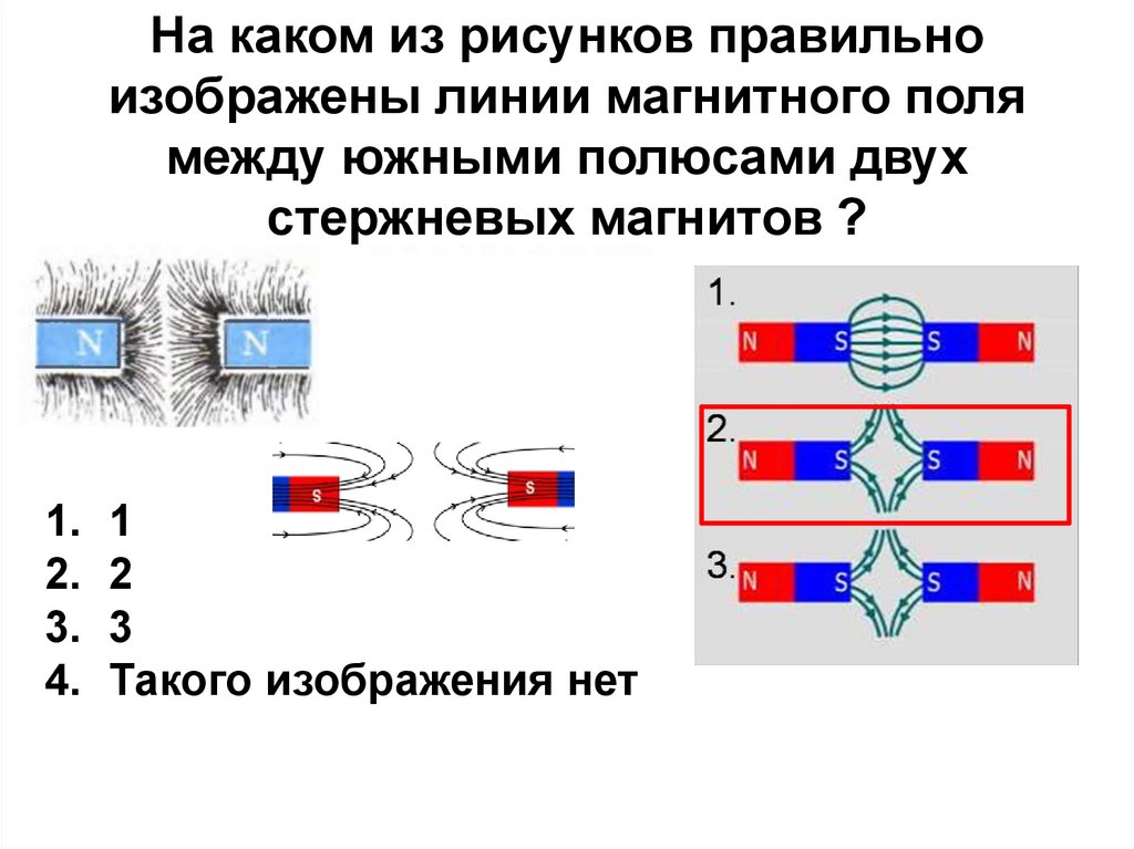 На каком из рисунков правильноизображены линии магнитного поля