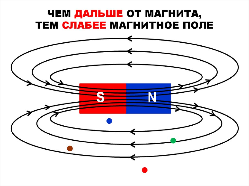 ЧЕМ ДАЛЬШЕ ОТ МАГНИТА,ТЕМ СЛАБЕЕ МАГНИТНОЕ ПОЛЕ