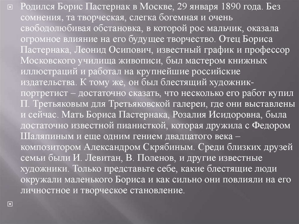 Родился Борис Пастернак в Москве, 29 января 1890 года. Безсомнения, та творческая, слегка богемная и очень
