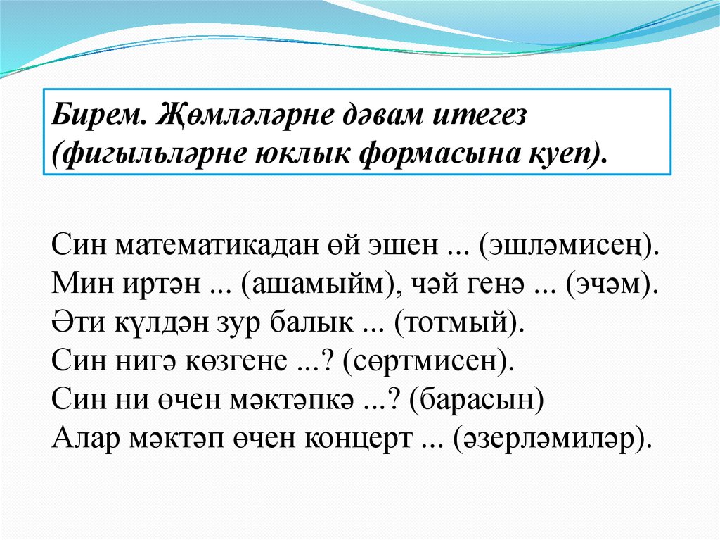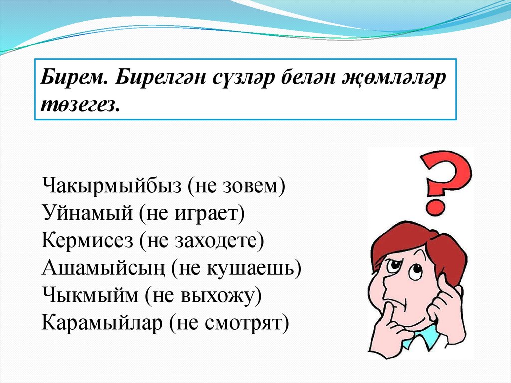 Бирем. Җөмләләрне дәвам итегез(фигыльләрне юклык формасына куеп).