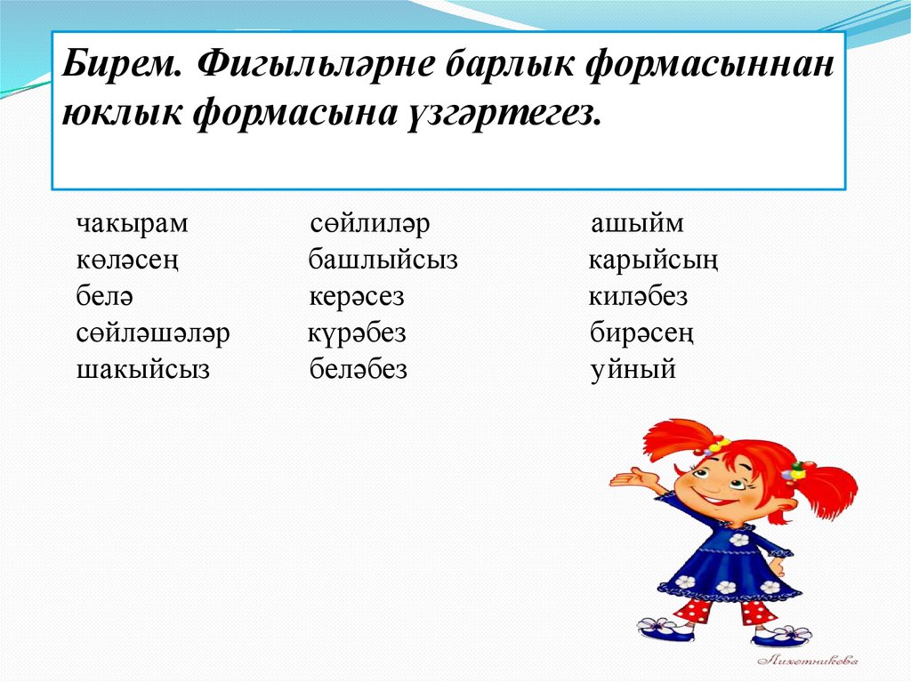 Бирем. Фигыльләрне барлык формасыннанюклык формасына үзгәртегез.