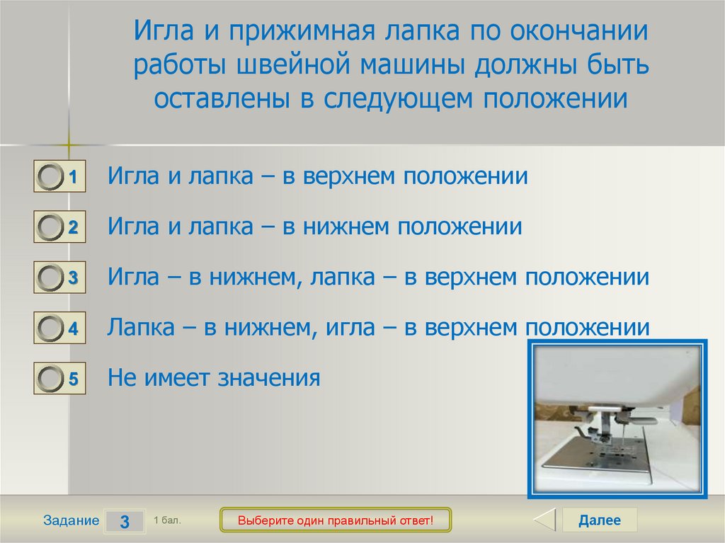 Игла и прижимная лапка по окончанииработы швейной машины должны быть