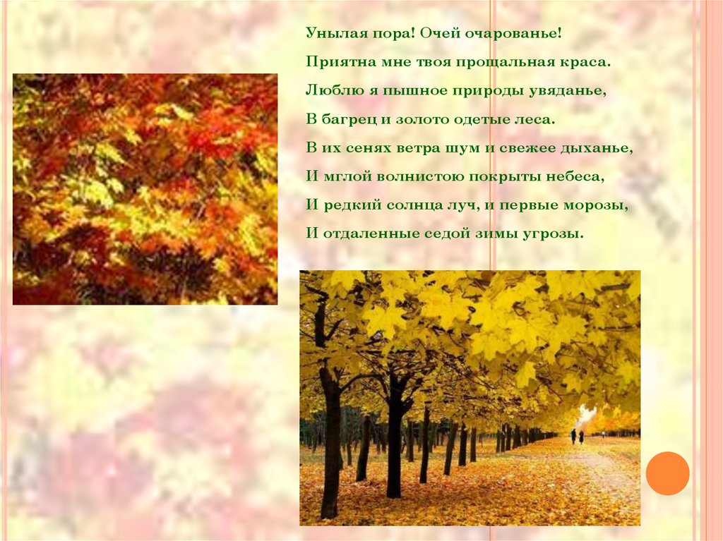 Унылая пора! Очей очарованье!Приятна мне твоя прощальная краса.