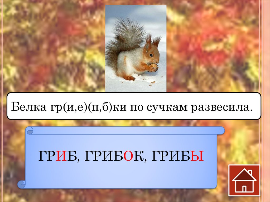 Белка гр(и,е)(п,б)ки по сучкам развесила.ГРИБ, ГРИБОК, ГРИБЫ