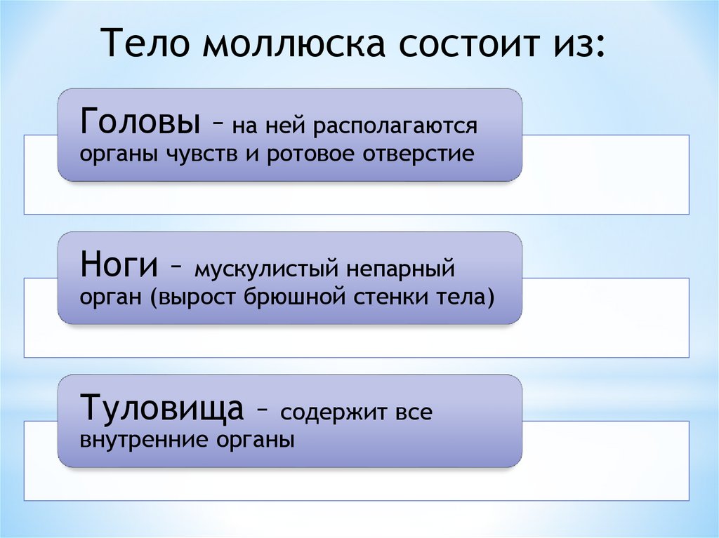Тело моллюска состоит из:Головы – на ней располагаются