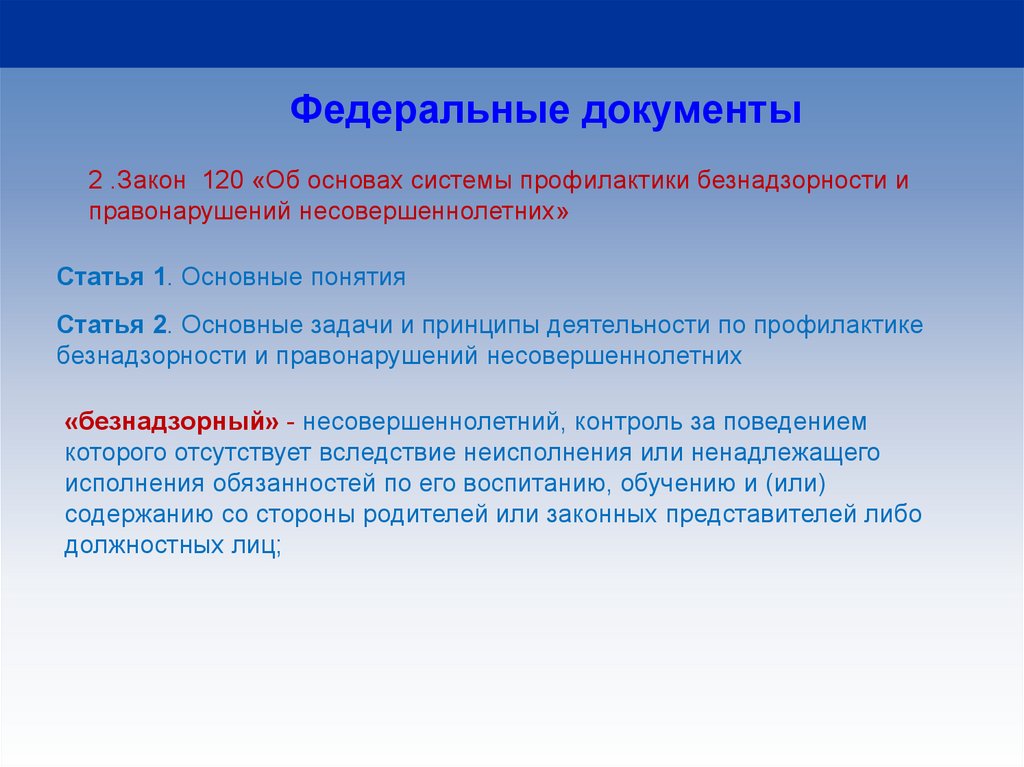 Федеральные документы2 .Закон 120 «Об основах системы профилактики безнадзорности и