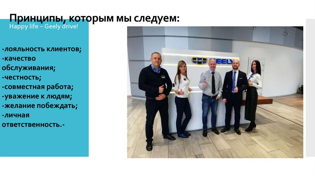 Принципы, которым мы следуем:Happy life – Geely drive!