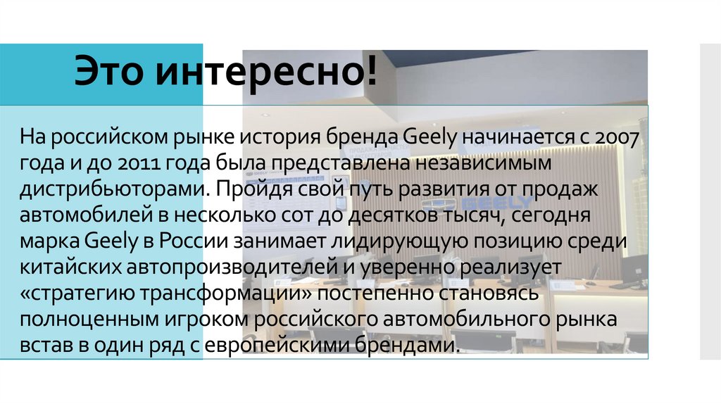 Это интересно!На российском рынке история бренда Geely начинается с 2007