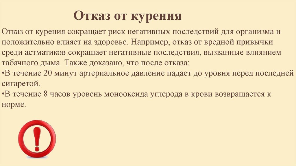 Отказ от куренияОтказ от курения сокращает риск негативных последствий для организма и