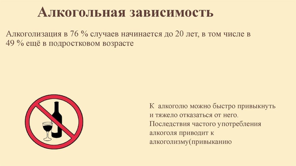Алкогольная зависимостьАлкоголизация в 76 % случаев начинается до 20 лет, в том числе в