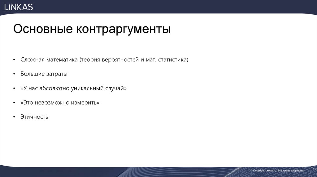 Основные контраргументы• Сложная математика (теория вероятностей и мат. статистика)
