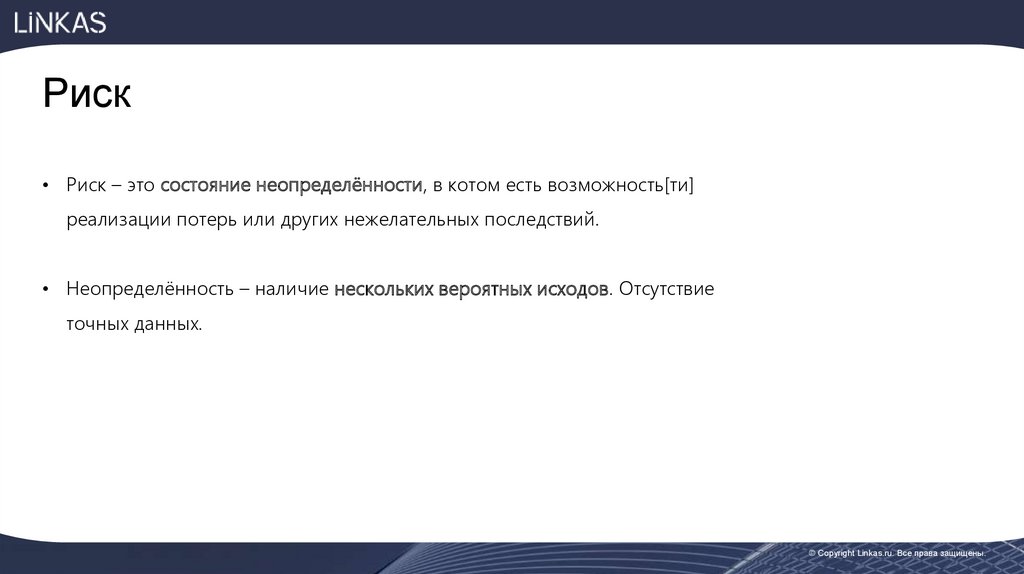 Риск• Риск – это состояние неопределённости, в котом есть возможность[ти]