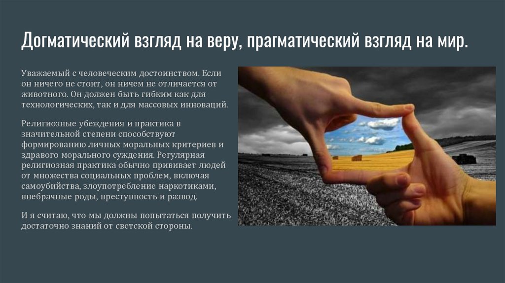 Догматический взгляд на веру, прагматический взгляд на мир.Уважаемый с человеческим достоинством. Если