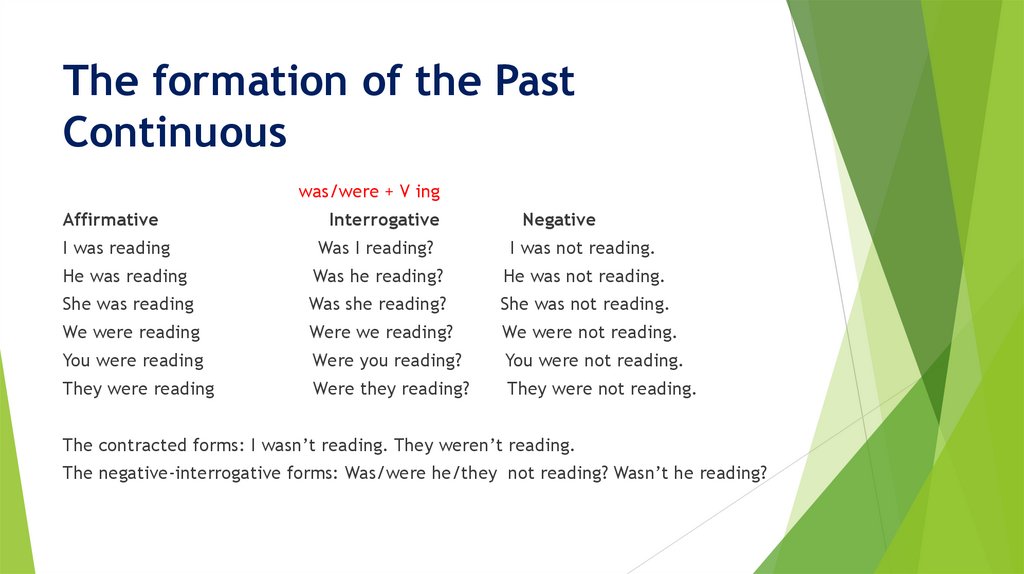 The negative-interrogative forms: Was/were he/they not reading? Wasn’t he reading?