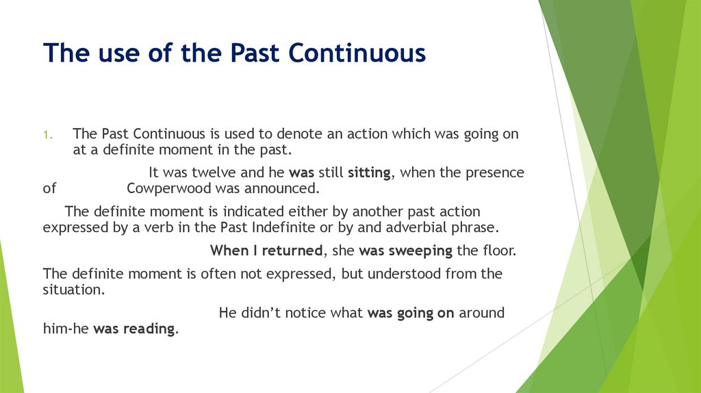 The use of the Past ContinuousThe Past Continuous is used to denote a certain state or quality peculiar to