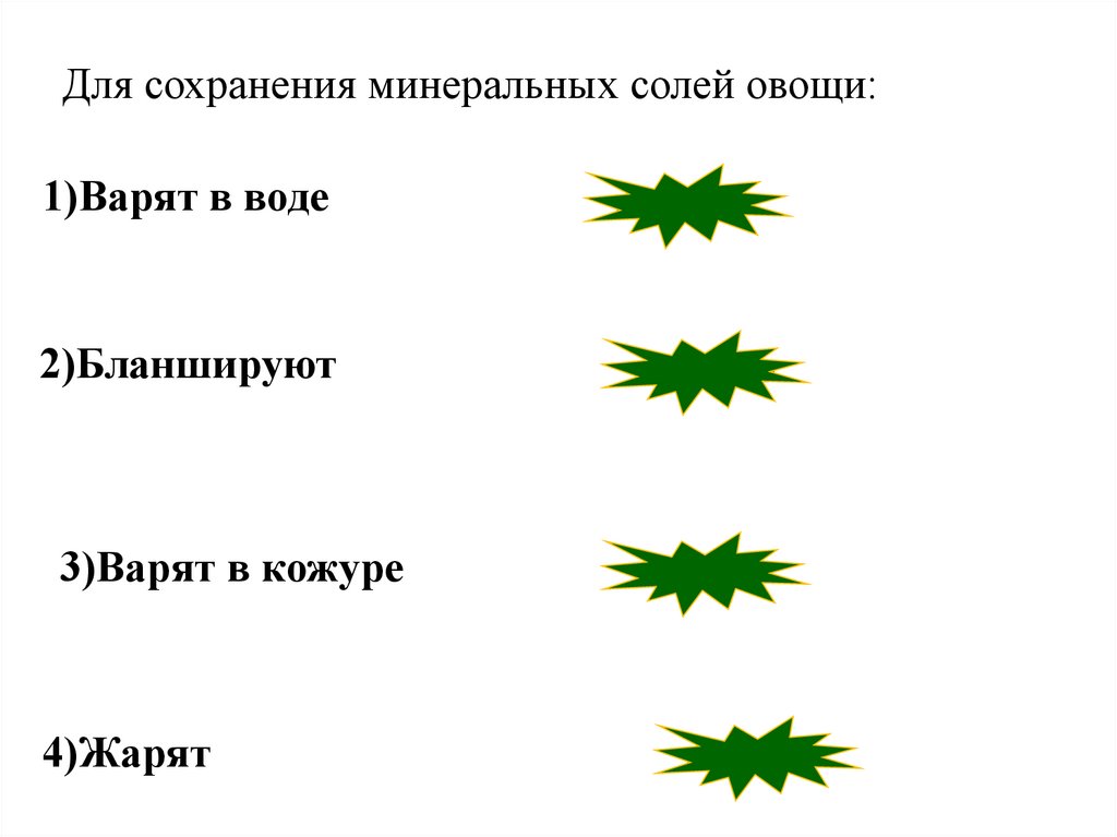 Для сохранения минеральных солей овощи:1)Варят в воде