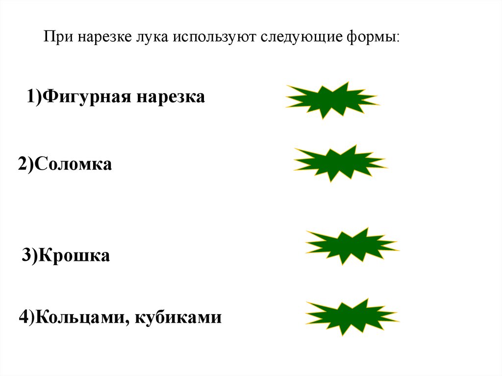 При нарезке лука используют следующие формы:1)Фигурная нарезка