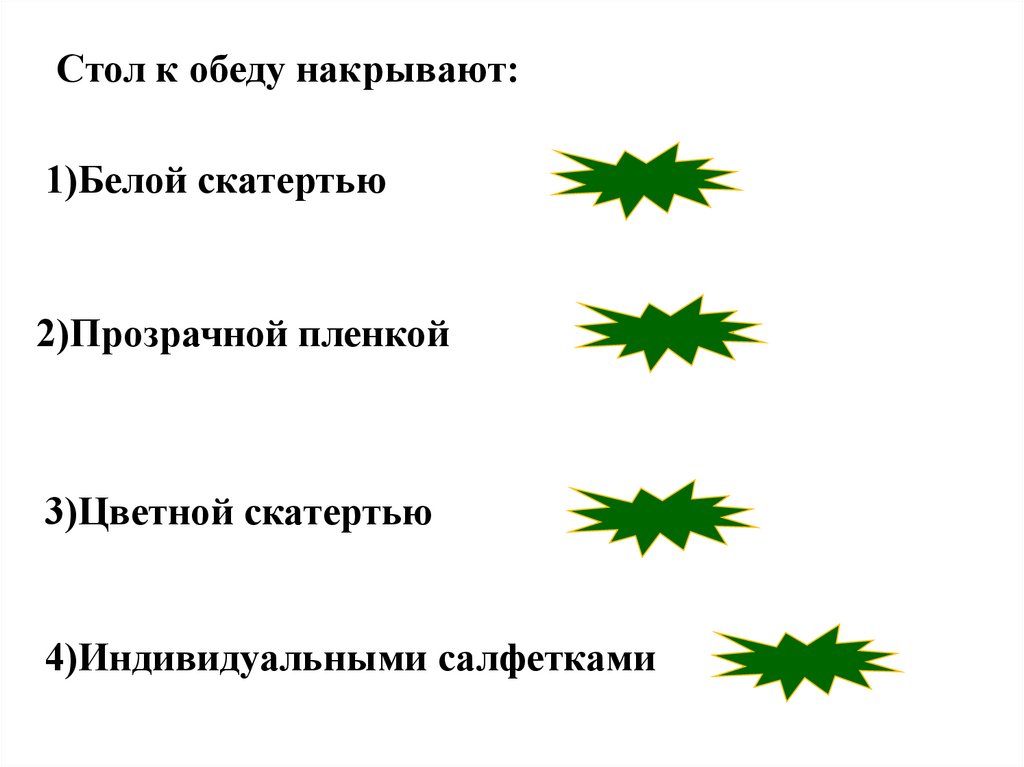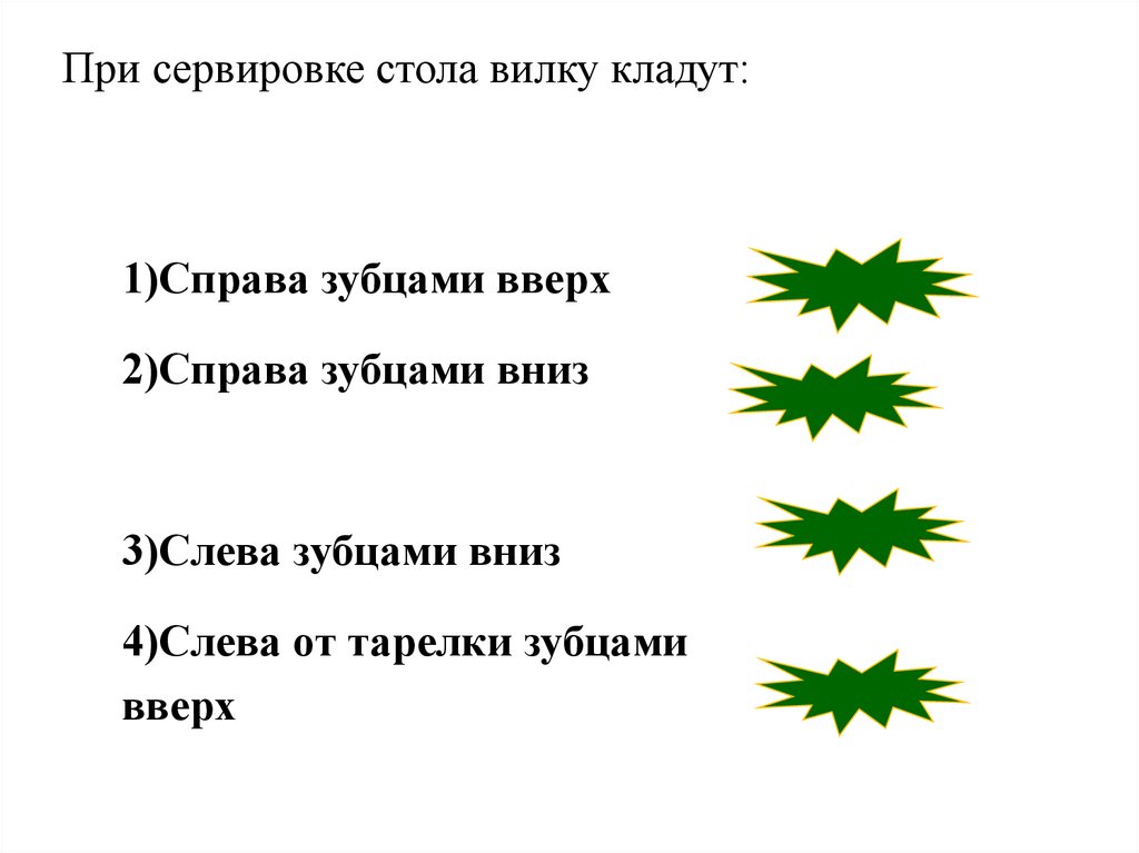При сервировке стола вилку кладут:1)Справа зубцами вверх