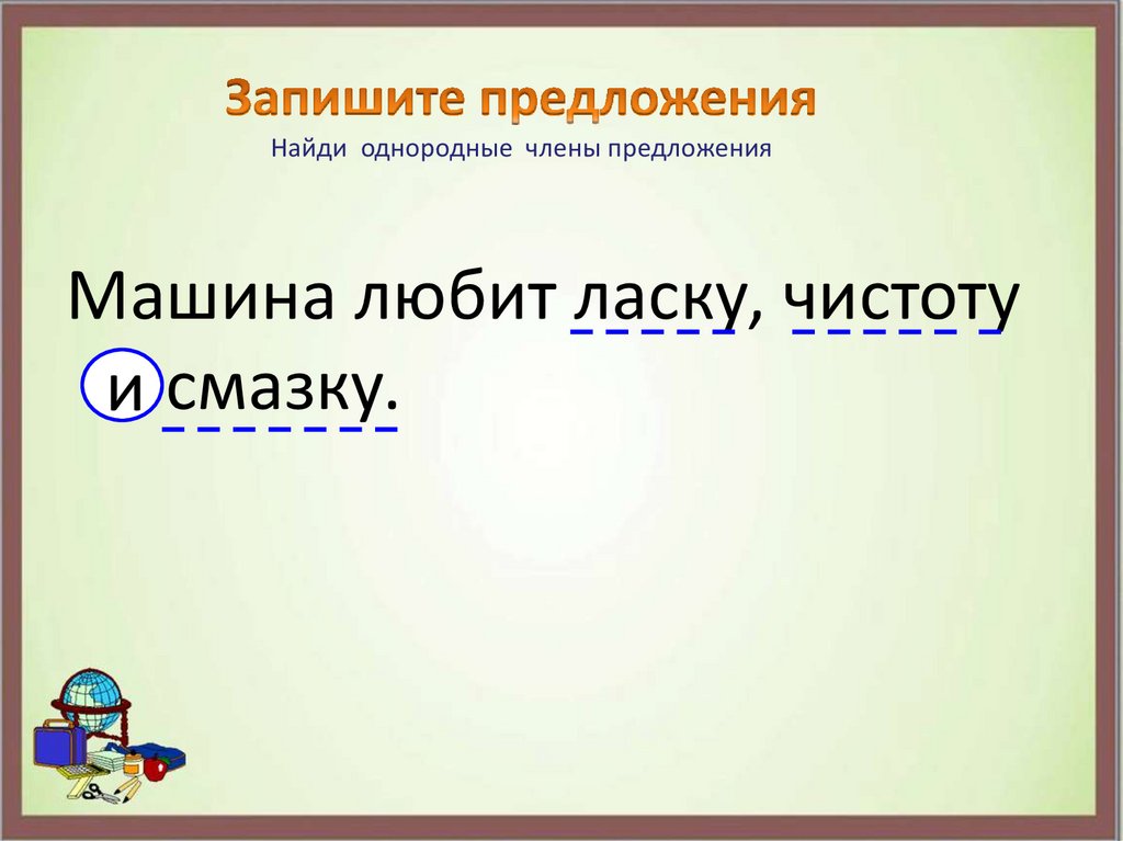 Найди однородные члены предложенияМашина любит ласку, чистоту