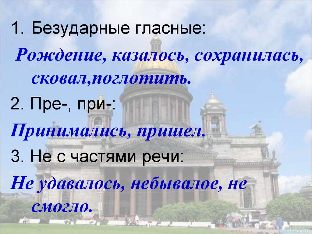 1. Безударные гласные:Рождение, казалось, сохранилась,