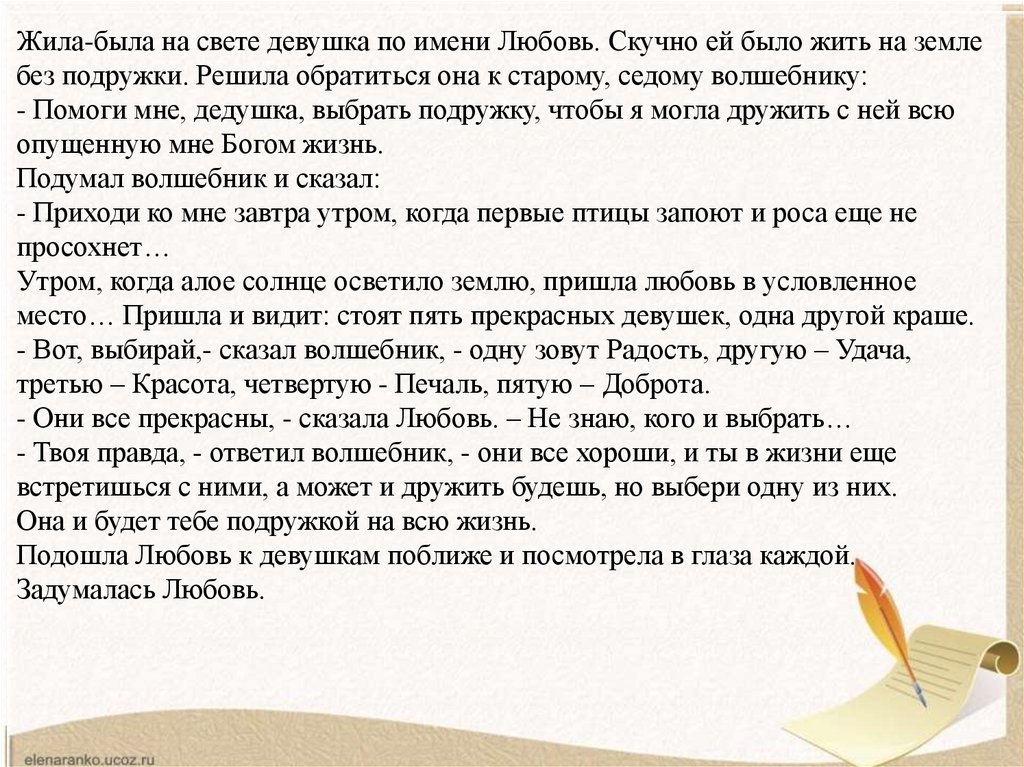 Жила-была на свете девушка по имени Любовь. Скучно ей было жить на землебез подружки. Решила обратиться она к старому, седому волшебнику: