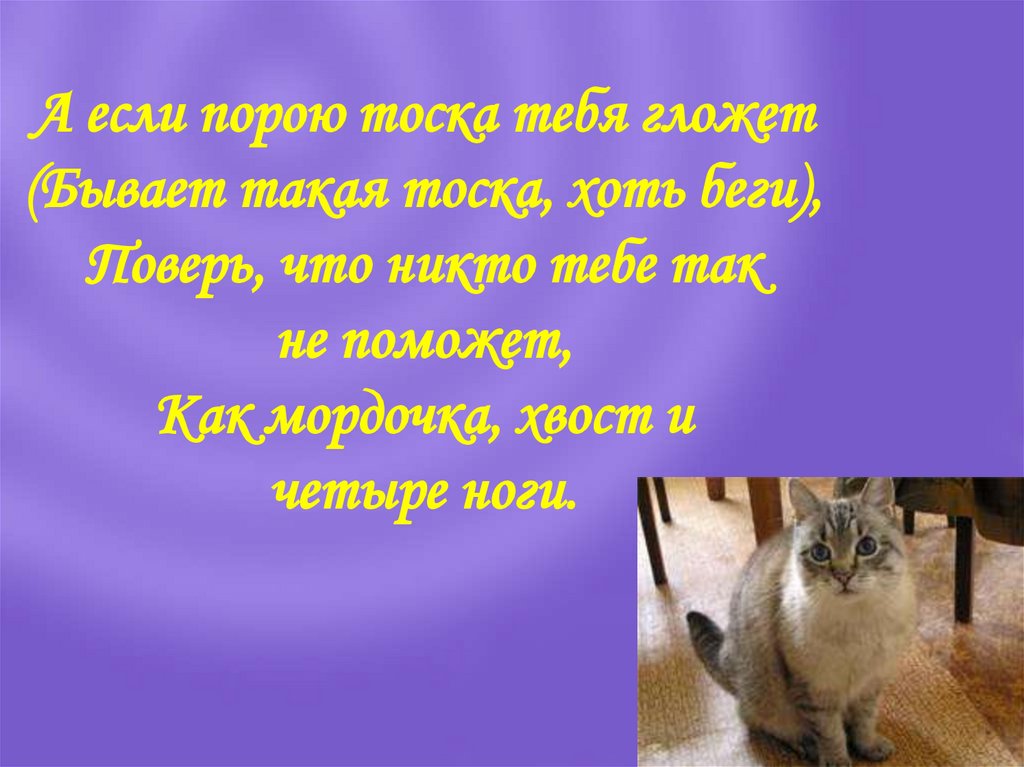 14. Кошка в человеке вообще не нуждается. Она в чем нуждается? В тепле, в пище. Это да. Сам человек ей совершенно не нужен.