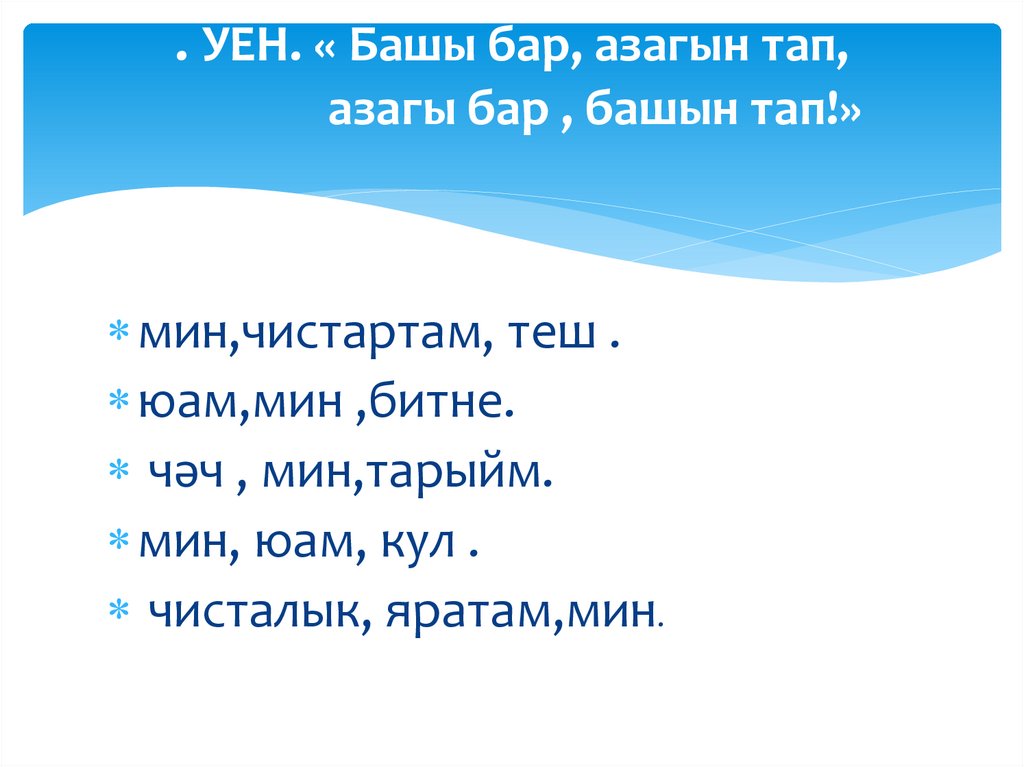 . УЕН. « Башы бар, азагын тап,азагы бар , башын тап!»