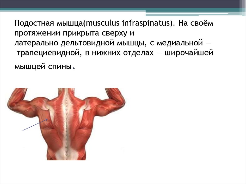 Подостная мышца(musculus infraspinatus). На своёмпротяжении прикрыта сверху и