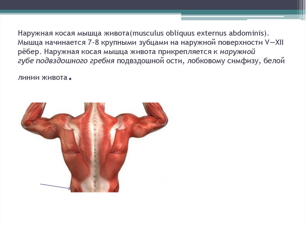 Наружная косая мышца живота(musculus obliquus externus abdominis).Мышца начинается 7-8 крупными зубцами на наружной поверхности V—XII