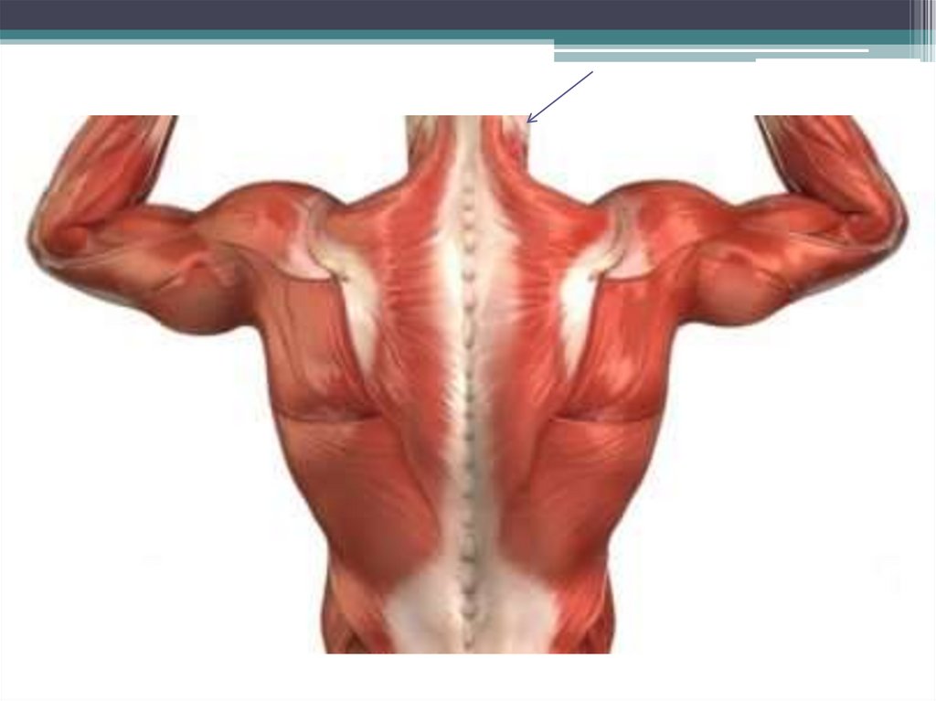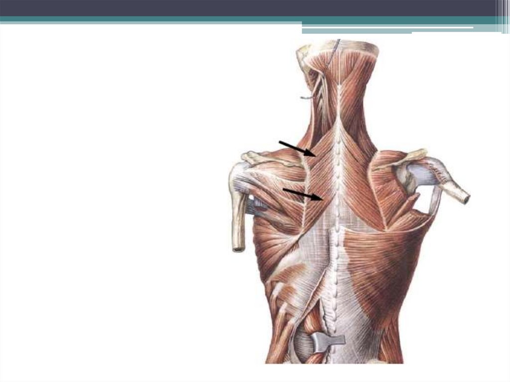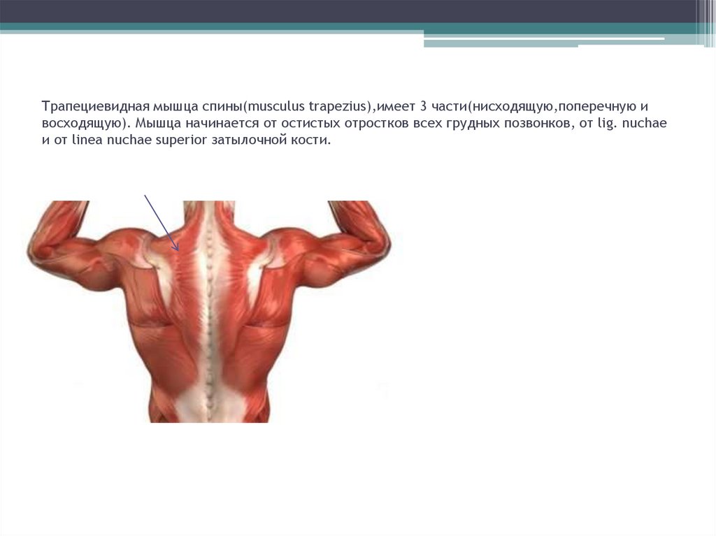 Трапециевидная мышца спины(musculus trapezius),имеет 3 части(нисходящую,поперечную ивосходящую). Мышца начинается от остистых отростков всех грудных позвонков, от lig. nuchae