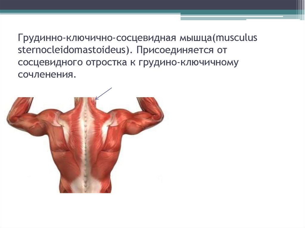 Грудинно-ключично-сосцевидная мышца(musculussternocleidomastoideus). Присоединяется от