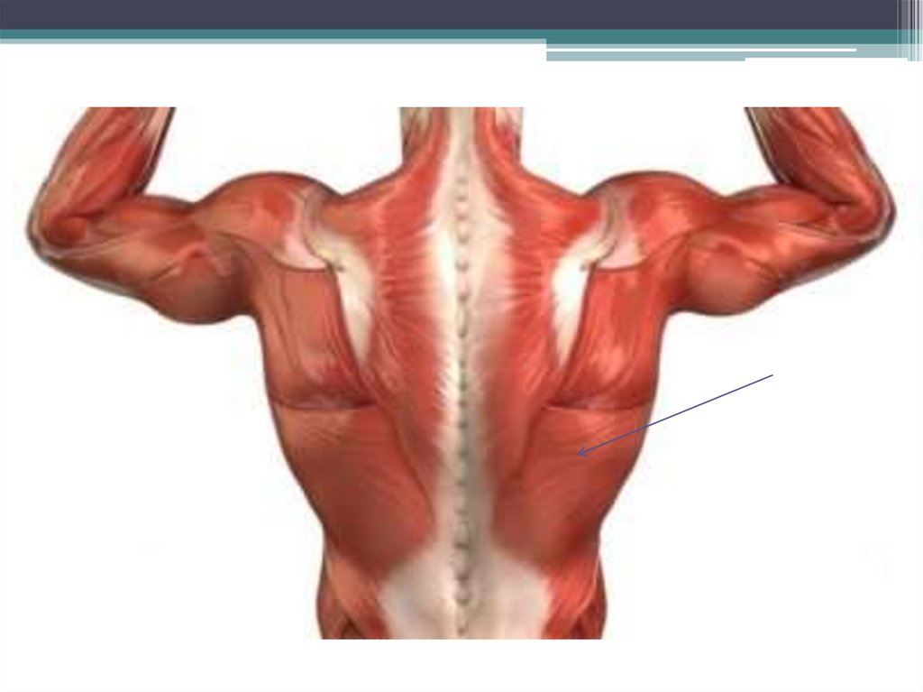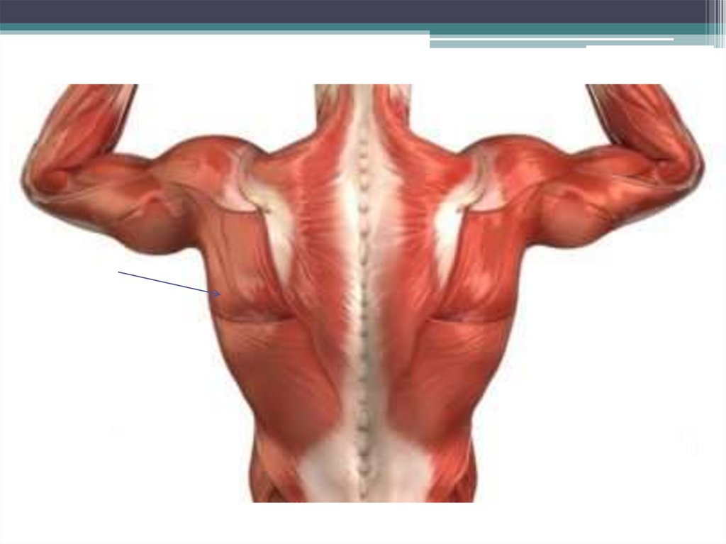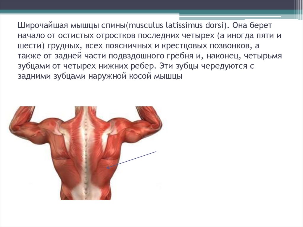 Широчайшая мышцы спины(musculus latissimus dorsi). Она беретначало от остистых отростков последних четырех (а иногда пяти и