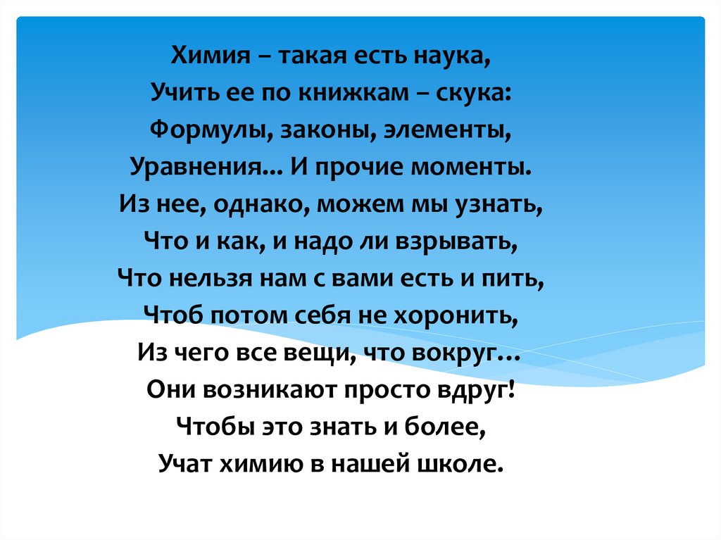 Химия – такая есть наука,Учить ее по книжкам – скука:
